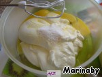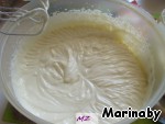 Отдельно взбиваем 4 желтка, 2 белка, пакетик ванильного сахара и творожную пасту до кремообразного состояния.