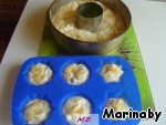 В силиконовую форму на дно я высыпала смесь сахарной пудры с кокосовой стружкой и добавила творожную массу, в форму для кекса выложила оставшуюся творожную массу.