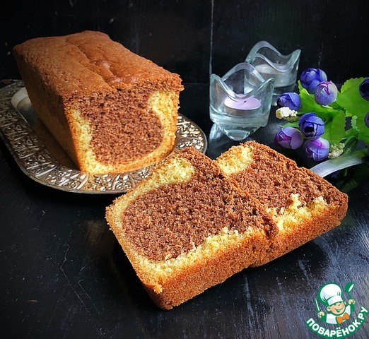 В смазанную маслом форму для кекса выложить сначала светлое тесто, а сверху осторожно вылить темное тесто с какао.