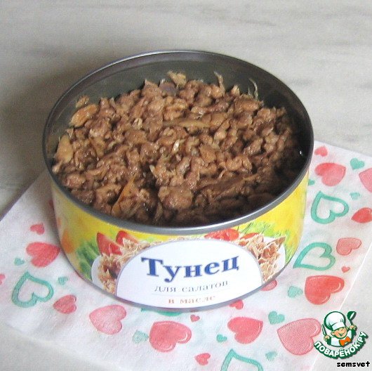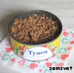 Из банки с тунцом слить жидкость. Можно сохранить немного жидкости в отдельной мисочке, чтобы добавить при желании в готовый салат.