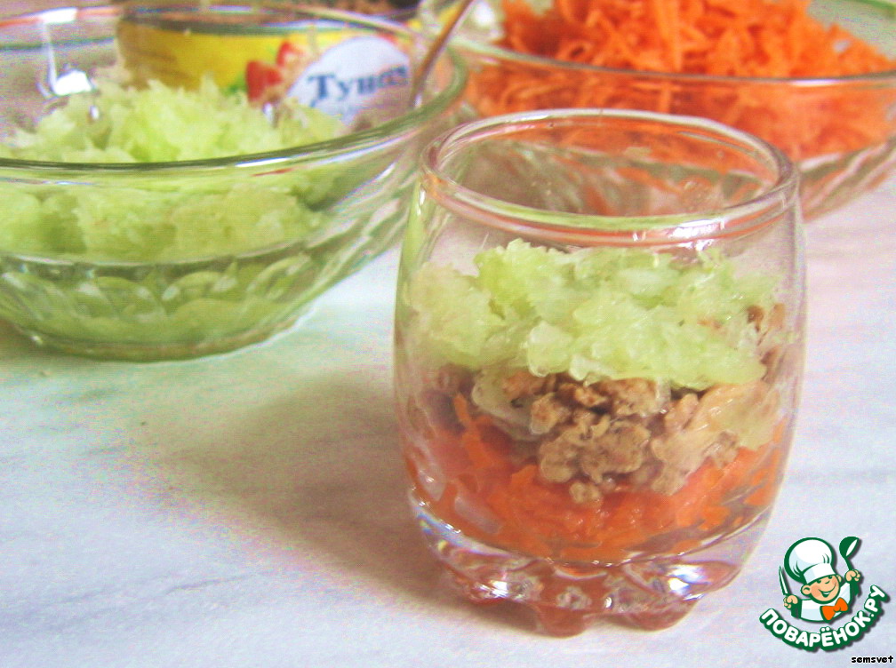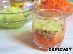 Именно этот вариант подачи самый удачный, хоть и требует некоторого времени на формирование порций. Зато салат долго остаётся свежим, овощи не теряют яркости и не обмениваются ароматами. -