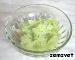Стебли сельдерея натереть на мелкой тёрке. Оставшиеся жёсткие волокна выкинуть, выделившуюся жидкость слить.