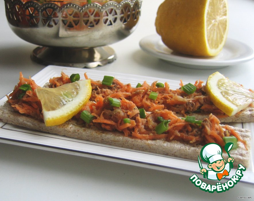 Готовый салат можно выложить на зерновые хлебцы, крекеры или тосты. Подавать, украсив кусочками лимона и зеленью.