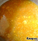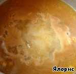 Помешивая, добавляем в смесь апельсиновый сок. От раскаленного масла сок начинает резко бурлить, это нужно ожидать, легко можно обжечься.