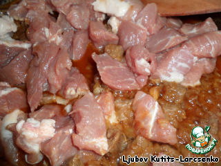 В жир кладем мелко нарезанный лук и обжариваем, добавляем паприку. Быстро размешиваем, чтобы паприка не подгорела (иначе она приобретёт неприятный вкус и цвет - это важно). Сразу кладём говядину, солим ее и тушим до тех пор, пока не выпарится выделенный ею сок.