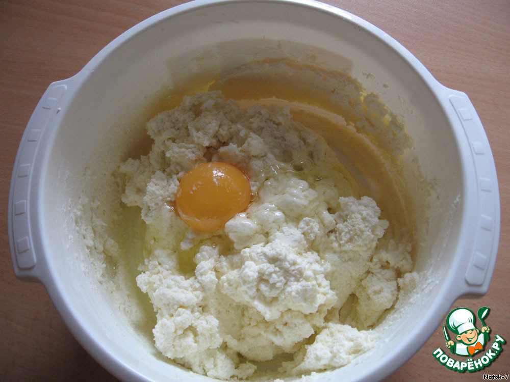 творог хорошенько размять, добавить в него сахар, яйцо, 1 столовую ложку манки, 5 грамм ванильного сахара. Все хорошо перемешать до однородной массы. -
