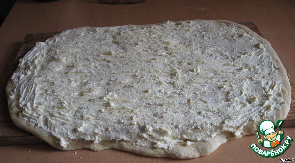 Тесто раскатать в один пласт 6-7 мм и равномерно распределить по его поверхности творожную начинку.