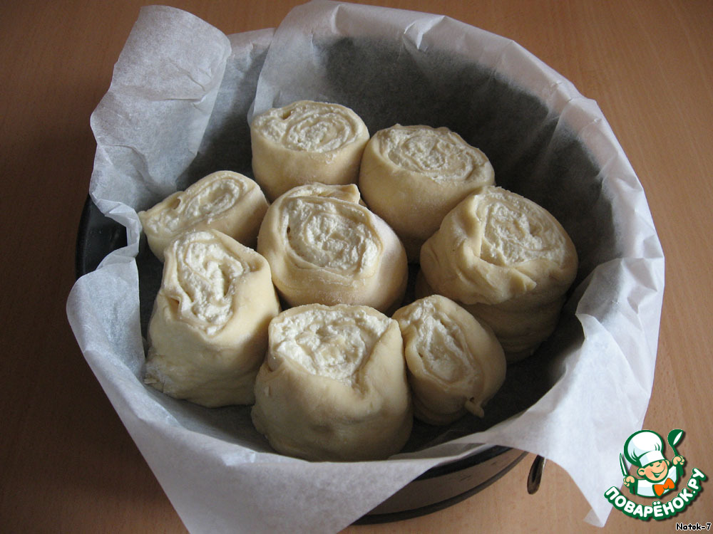 рулета, расположив их вертикально. Дать им расстояться минут 10-15, пока они не увеличатся в размере. Смазать пирог взбитым яйцом и поставить в предварительно нагретую до 200 градусов духовку. Через 30 минут накрыть верх пирога фольгой. Печь до готовности. У меня на это ушло приблизительно 50 минут. -