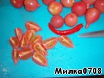 Режем помидорки на четвертинки (если черрики, то достаточно разрезать пополам).