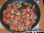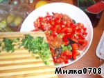 Режем наше филе, добавляем к нему помидорки (я не люблю острое, поэтому перец чили добавлять в салат не стала, просто добавила его, когда запекала).