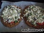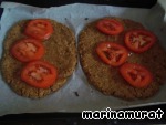 Достаем лепешки. Режем помидор на кружочки и кладем на лепешки.