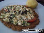Делаем начинку: смолоть в блендере петрушку и лук-порей, мелко накрошить 1/2 огурца, оливки нарезать на четвертинки, смешать с творогом, добавить перец черный и красный, другие приправки - по желанию, посолить (у меня был соленый творог). -