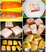 Лосось у меня замороженный. Разморозился. Я его нарезала на восемь кусков и панировала с двух сторон в подсоленной муке. В разогретой сковороде слегка (немного, но не до готовности) обжарила. В оригинальном рецепте лосось не обжаривался, нарезанные кусочки сразу помещались в посуду для запекания.