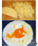 Сыр люблю использовать не тёртый, а мелко нарезанный. Тёртый быстро и бесследно тает. (В оригинале автор использовала майонез, но у меня не было времени его приготовить, и я заменила его сметаной, взбитой вместе с яйцами).