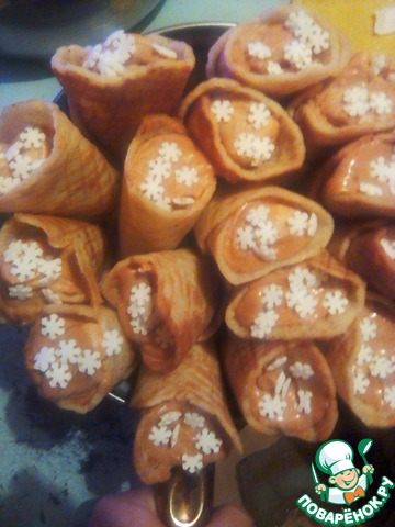 Вафли скручивать в трубочки сразу же, а то будут ломаться. Теплые вафли накрыть полотенцем, а лучше сразу съесть :-).