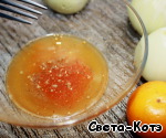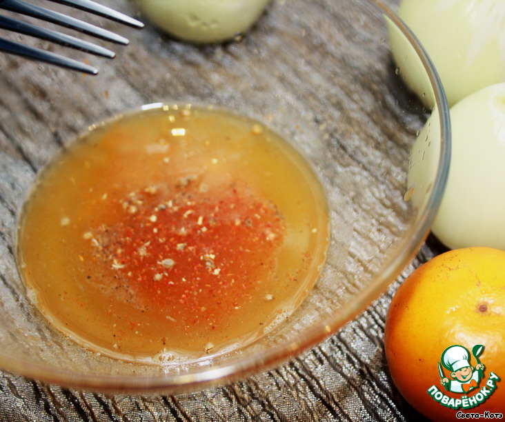 Отдельно смешать выжатый сок апельсинов, коньяк, специи и соль.