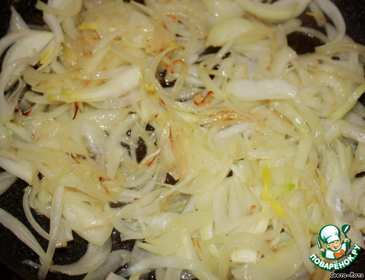 Отдельно поджарить крупно нарезанный лук, выложить его сверху мяса.