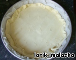 Готовое тесто раскатать, выложить в форму, наколоть вилкой. Накрыть бумагой для выпечки, засыпать горохом или фасолью и поставить в разогретую до 180 градусов духовку и печь до золотистого цвета (минут 15). Горох нам нужен для того, чтобы тесто не вздувалось при выпечке. (Но я этого не делала, просто слегка прижала тесто, когда оно было почти готово, чтобы оно немного опустилось).