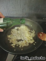 В сковороде разогреть растительное масло, высыпать лук и обжарить до готовности (до золотистого цвета), на это уйдет минут 5-7. По желанию, можно влить белое вино и тушить лук до испарения влаги.