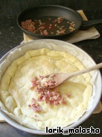 Тесто слегка зарумянилось, выложить на него смесь лука и бекона.