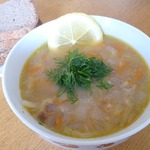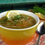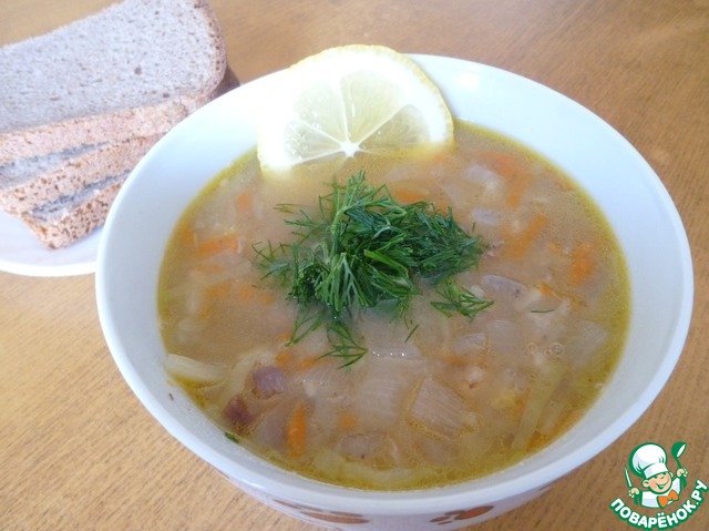 При подаче посыпаем мелко нарезанным укропом и добавляем сок кружка лимона в каждую тарелку. Лимонный сок сильно меняет вкус супа, делает его более интересным и с легкой кислинкой. Т. е. я попробовала и без лимона, но с лимоном мне понравилось намного больше.