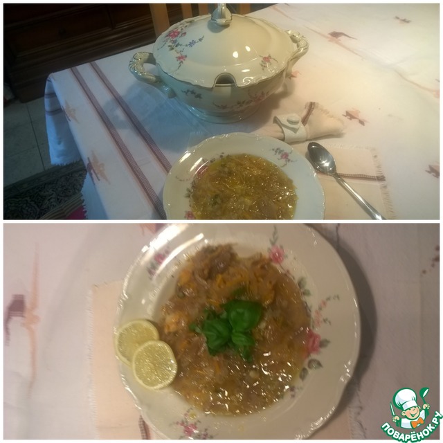 - Сок лимонный (для подачи, обязательно - очень обогащает вкус, на 1 порцию - сок из достаточно толстого кружка лимона)