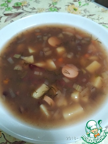 Когда картофель сварится, добавить подрумяненные овощи, измельченный жгучий перец, нарезанные кружочками сосиски, фасоль и варить еще около 5 -7 мин.