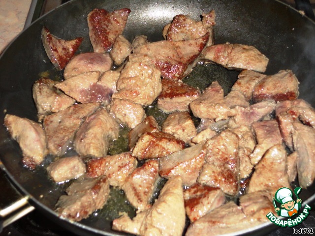 Печень промыть, очистить от пленок, нарезать небольшими кусочками, и обжарить на растительном масле до готовности. Как печень будет готова, выложить ее из сковороды в тарелку.