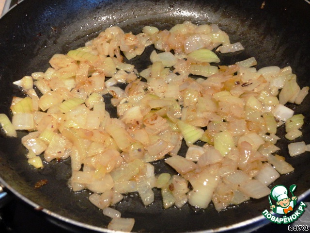 На оставшемся масле после жарки печени, обжариваем репчатый лук, нарезанный небольшими кубиками.