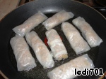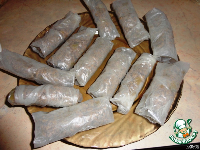 Рисовые блинчики смачиваем в горячей воде (налейте в тарелку горячую воду и окунайте туда блинчики). Смочив один блинчик, заверните в него готовый фарш. Блинчики смачивайте по одному, чтобы сразу завернуть фарш.