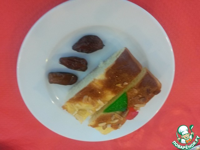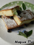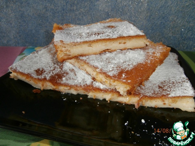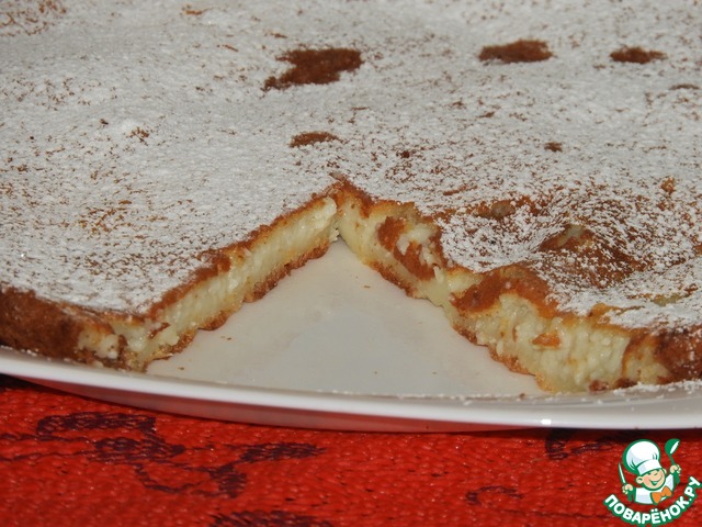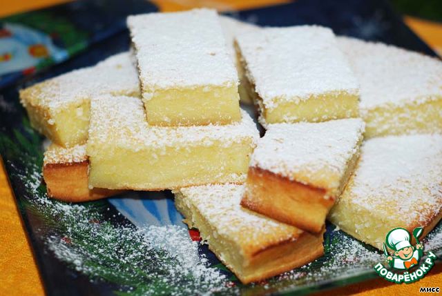 Когда полностью остынет, припудрите сахарной пудрой и разделите пирог на квадратики.