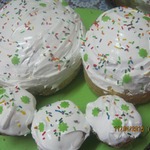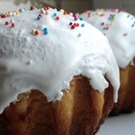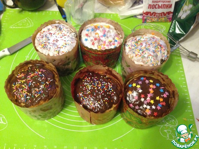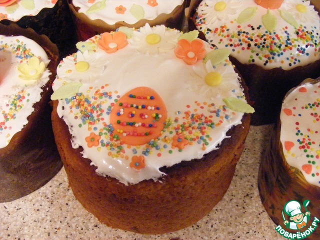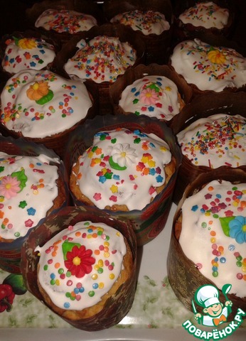 Горячие куличи смазать глазурью. У меня 1 белок, взбитый с 0,5 стакана сахара.