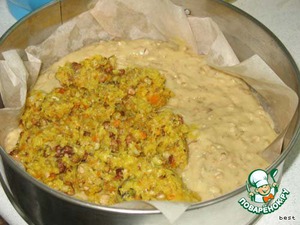 В форму выложить половину теста. Затем выложить начинку. Сверху выложить вторую половину теста. Разровнять его ложкой и поставить в духовку. Выпекать около 40-50 минут, до образования румяной корочки.