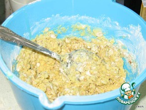Соединить яичную смесь с мукой, добавить овсяные хлопья, сверху полить медово-масляной смесью. Перемешать все продукты тщательно до получения однородного теста. -