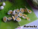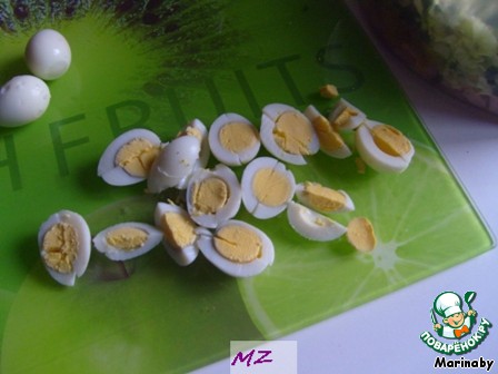 Порезать на четвертинки перепелиные яйца.