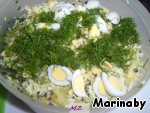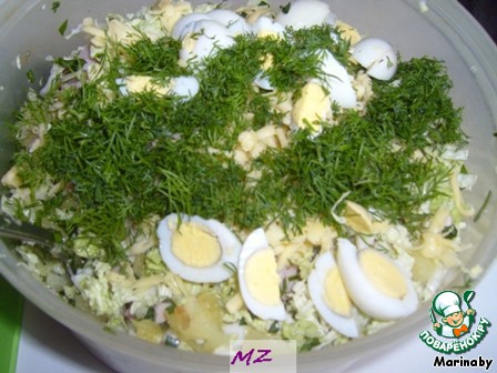 Подавать можно в общей салатнице или порционно, украсив четвертинками яиц, укропом и помидорками.
