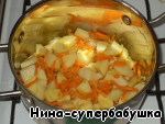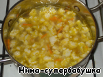 Залить кипящей водой (или куриным бульоном) так, чтобы она покрыла овощи (2 чашки). Варить на слабом огне до полуготовности (около 5-ти минут).