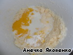 Затем добавить желтки, молоко, ванильный сахар, разрыхлитель, тщательно взбить.