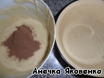 Полученное тесто разделить на 2 части. В одну добавить какао и хорошо перемешать.