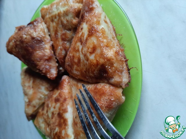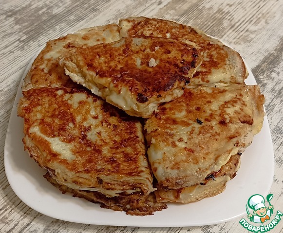 После истечения часа вынимаем все из холодильника, на разогретой и немного (!) смазанной маслом сковороде жарим с двух сторон тонкие блинчики. На 1 шт. я брала полповарешки теста. Важно, чтобы одна сторона была более зажаренной (на нее будем класть начинку).