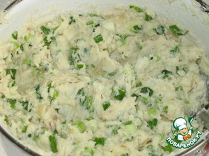 Картофель отварить, истолочь, сделать жидкое пюре, добавив молока или сметанки. Добавить обжареный репчатый лук и мелко порезанный зелёный лук. Посолить, поперчить (начинка на вкус должна быть немного солоноватой). -