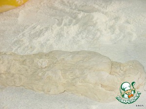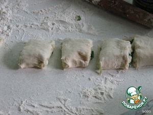 Места разреза слепляем руками, обваливаем в муке и переворачиваем на бок. Получается, что защипы оказываются снизу и сверху. -