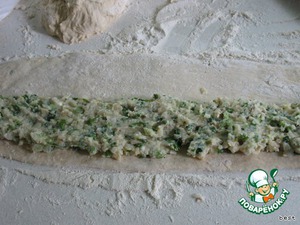 Отрываем кусочек теста, делаем руками колбаску и раскатываем скалочкой, чтоб получилась ленточка. Кладем начинку, защепляем края.