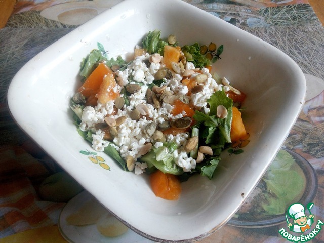 Сначала надо замариновать сыр и дать ему настояться. Не знаю, сколько этот процесс должен длиться, я мариновала после завтрака, а салат готовила к ужину. Т.к. салат делала в первый раз, не знаю, насколько вкус зависит от этих составляющих, но думаю, можно взять другое масло, оливковое для салатов предпочтительнее, и другой уксус, например, яблочный. Для маринада я смешала неполную ложку масла + чайную ложку уксуса + неполную чайную ложку меда + щепотку белого перца + пол чайной ложки сухого майорана. Сыр я готовила сама по рецепту [url=https://www.povarenok.ru/recipes/show/18665/]"Домашний сыр "Панир"[/url]. Хотела, чтобы он был не пресный, поэтому добавила соли и приправу «Прованские травы», но соли у меня там маловато, поэтому маринад подсолила. Сыр у меня получился не очень плотный, поэтому и здесь разваливается, но на вкусе это не отражается.