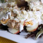 Рецепт этого блюда был размещен на сайте в 2007 году пользователем Анна20 под названием "Салат "Дипломат"" и иллюстрирован мной в рамках акции "Раскраски". Автор описал этот салат как "блюдо на любителя", а я как раз являюсь любителем сочетания яблока с сыром. А еще салат готовится практически моментально. В общем, кому интересно - прошу в гости!