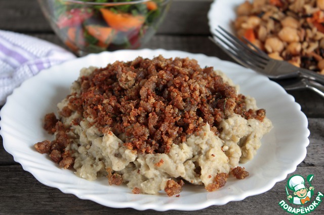 На тарелку кладем пасту из баклажанов и тахины, сверху сбрызгиваем слегка оливковым маслом, а наверх выкладываем готовый фарш вместе с жидкостью. Украшаем веточкой петрушки или розмарина и подаем к столу.