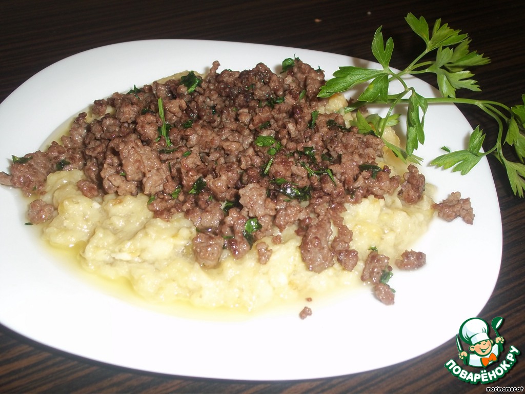 Когда фарш будет почти готов, добавим туда зелень петрушки (в оригинале нужен розмарин свежий, но у меня не оказалось, если у вас имеется, то делайте именно с ним). Мне же надо было добавить какую-то зелень, я добавила петрушку. Кладем еще кусочек сливочного масла и хорошо перемешиваем. Сливочное масло придает особый вкус и аромат мясу, только его не надо зажаривать, а лишь растопить и перемешать, чтобы весь фарш покрылся им. Да, поперчите по вкусу. Больше никаких приправ он добавлять не советует, кроме соли и черного молотого перца.