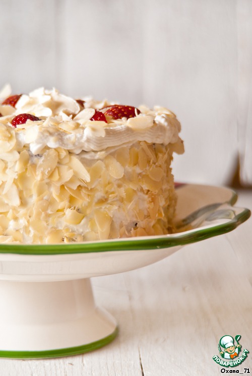 Края торта посыпать миндальными листиками. Украсить по желанию: клубникой и листиками мяты. Поставить в холодильник на всю ночь. |
