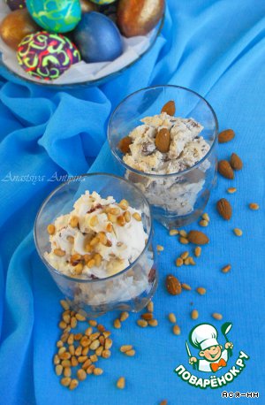 Примерно через 6-8 часов или утром, если повесить с вечера, снимаем пасху, развязываем ткань и перемешиваем содержимое так как с краев она уже стекла, а внутри еще жидкая. Затем вешаем обратно. Периодически повторяем процедуру, пока не добьемся нужной консистенции, пасха готова.