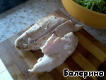 Для начала разберемся с филе! Для более вкусного "вкуса" )) я запекла филе в микроволновке, можно и отварить, конечно. И предварительно мое филе было замариновано в уксусе (для мягкости), горчице, ну и соль, перец, любимые специи.